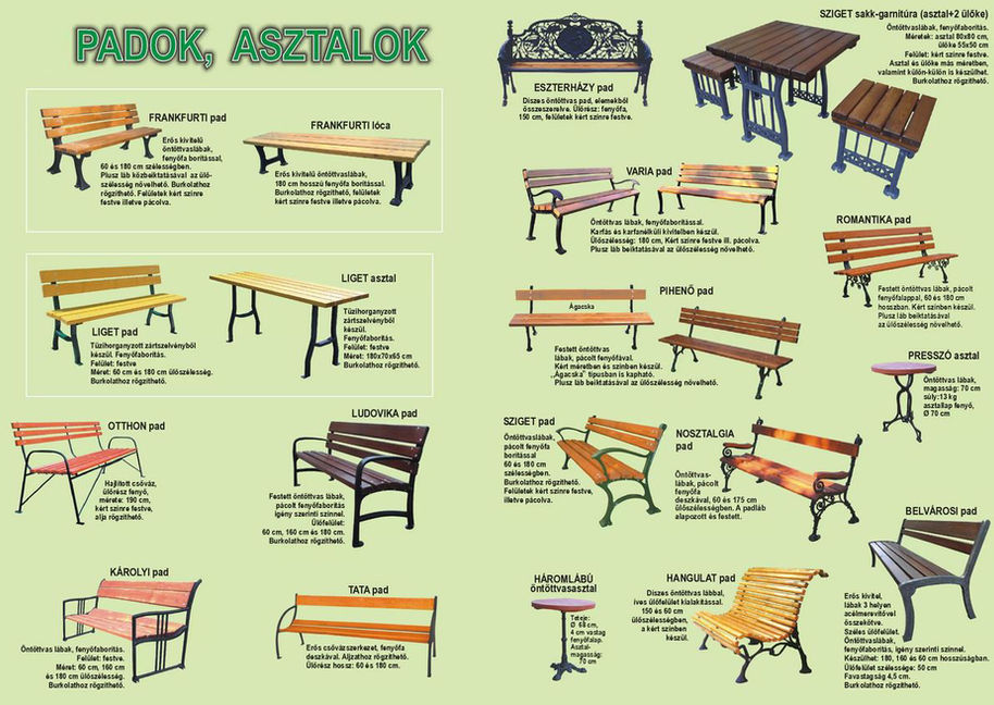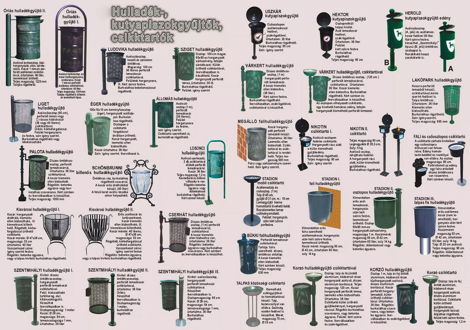 köztéri pad - köztéri asztal - köztéri hulladékgyűjtő - köztéri kutak -köztéri oszlop - köztéri kerékpártartó - köztéri növénytartó - köztéri kandeláber - köztéri információs tábla